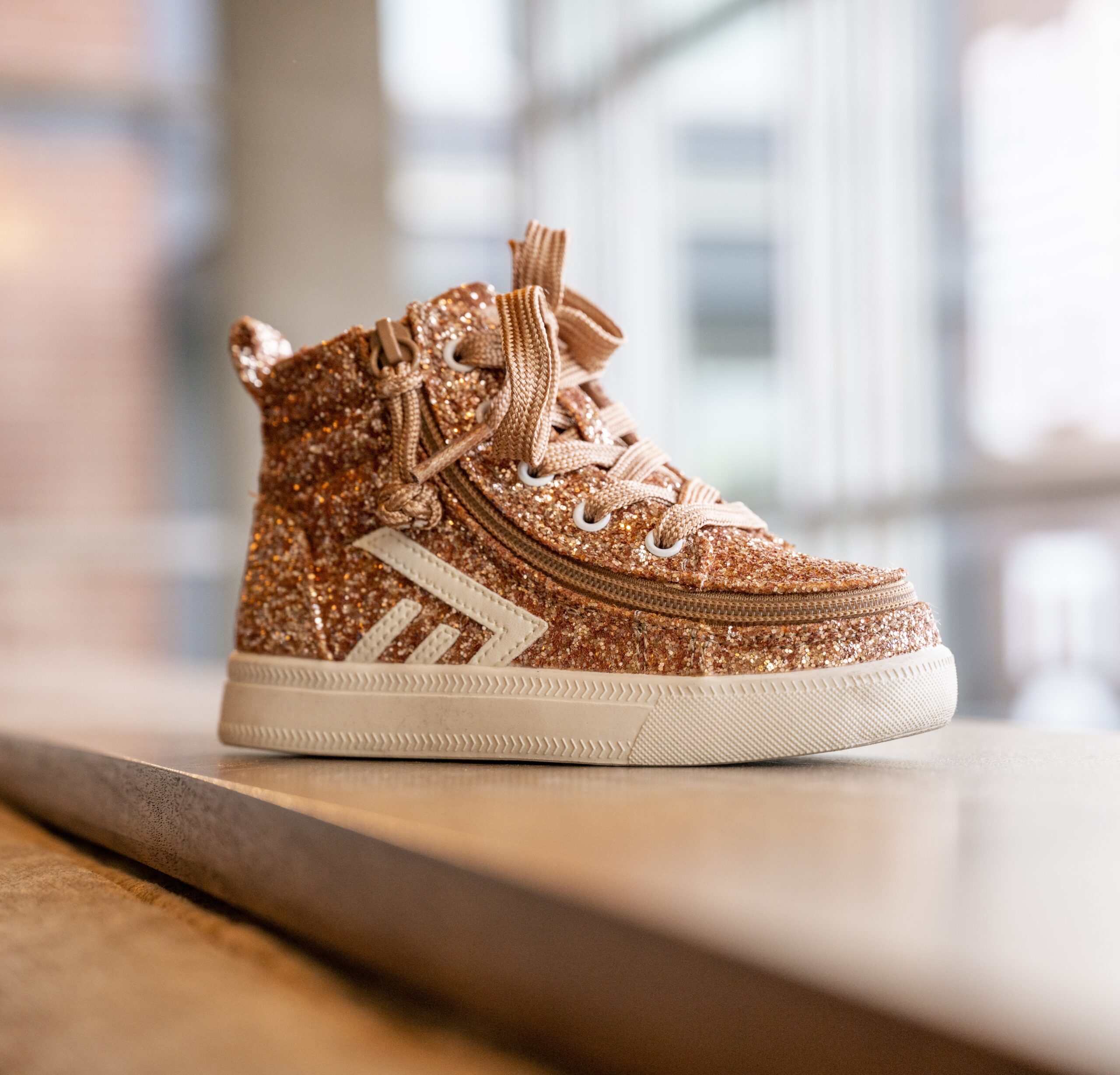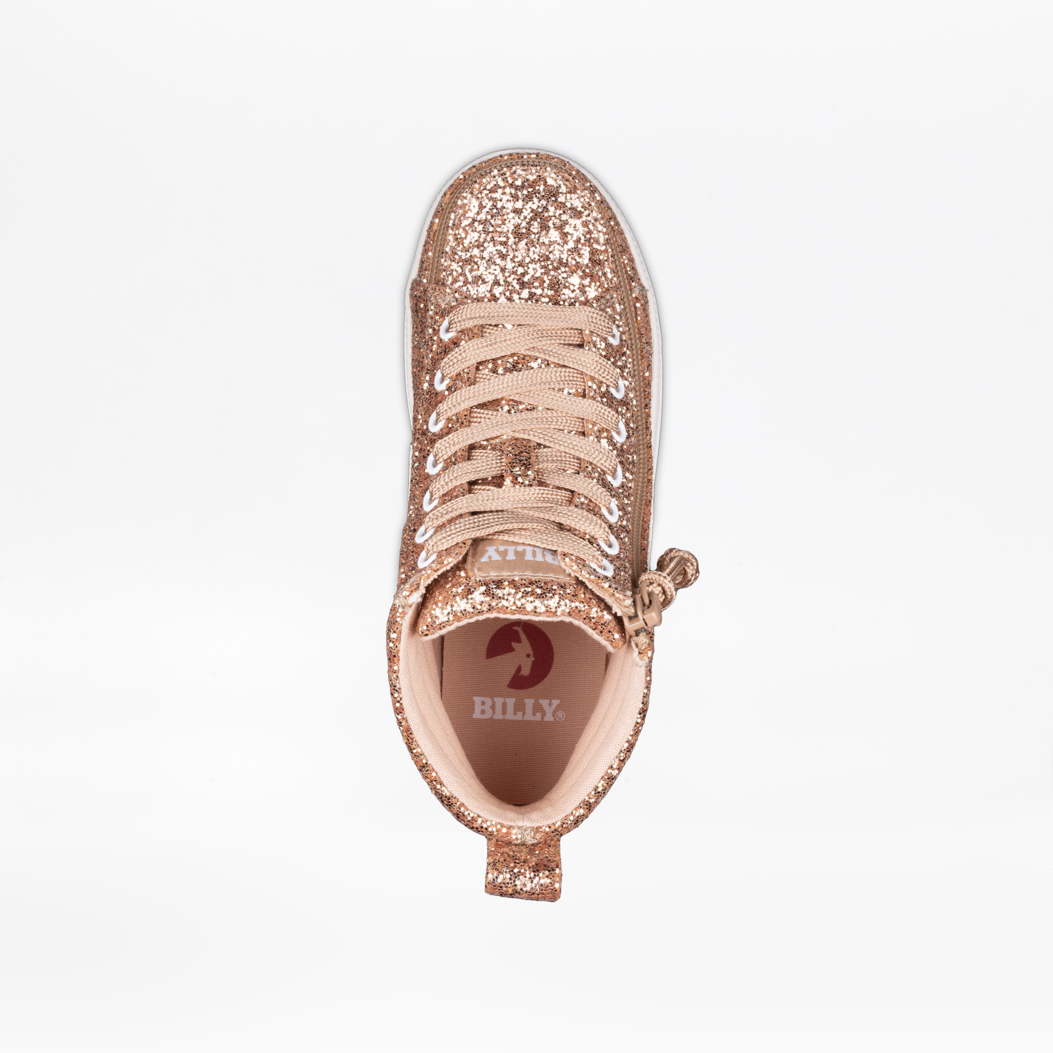Los zapatos Billy Footwear Rose Gold Glitz CS High son modernos, cómodos y funcionales, con un sistema de cremallera especial y único. La particularidad de este sistema de abertura es que toda la parte delantera y superior del zapato se abre con la ayuda de una cremallera, lo que nos facilita ponernos y quitarnos el calzado de manera sencilla. Están diseñados especialmente para niños y adultos con necesidades especiales que utilizan o no órtesis, férulas, DAFO o plantillas.